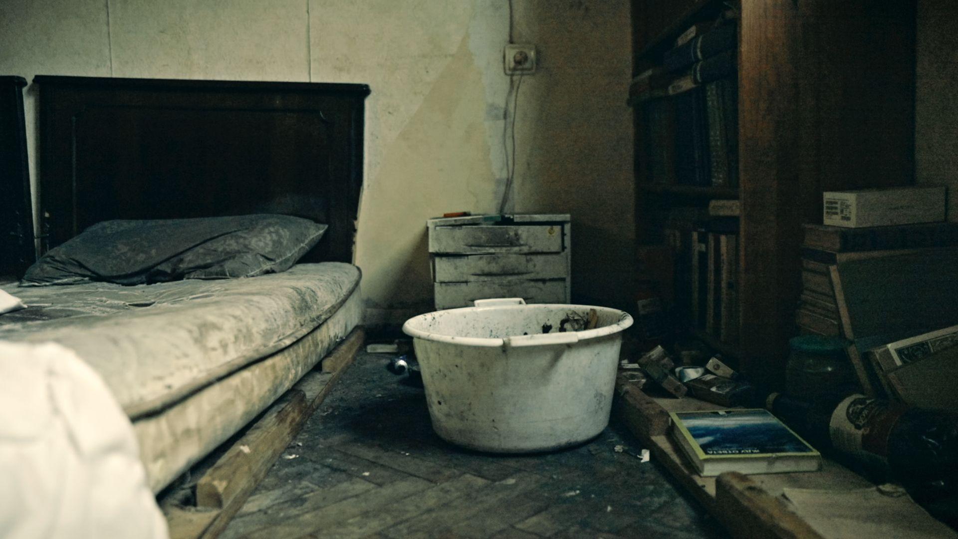 After a walk in the park, Olja returns to her friend's apartment - in one room there are piles of bloody mattresses, while in the corner there is a sink with dried vomit or blood.